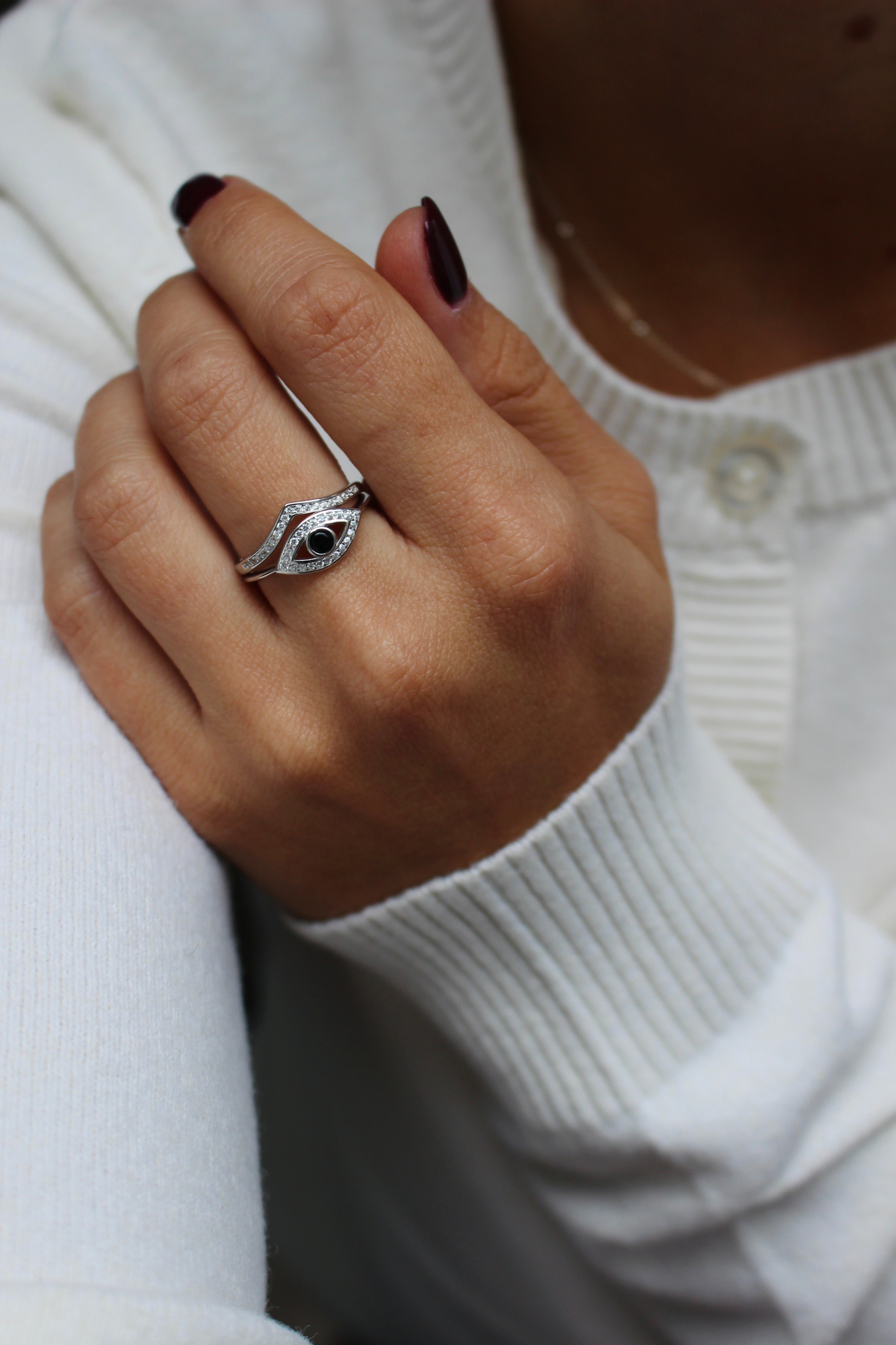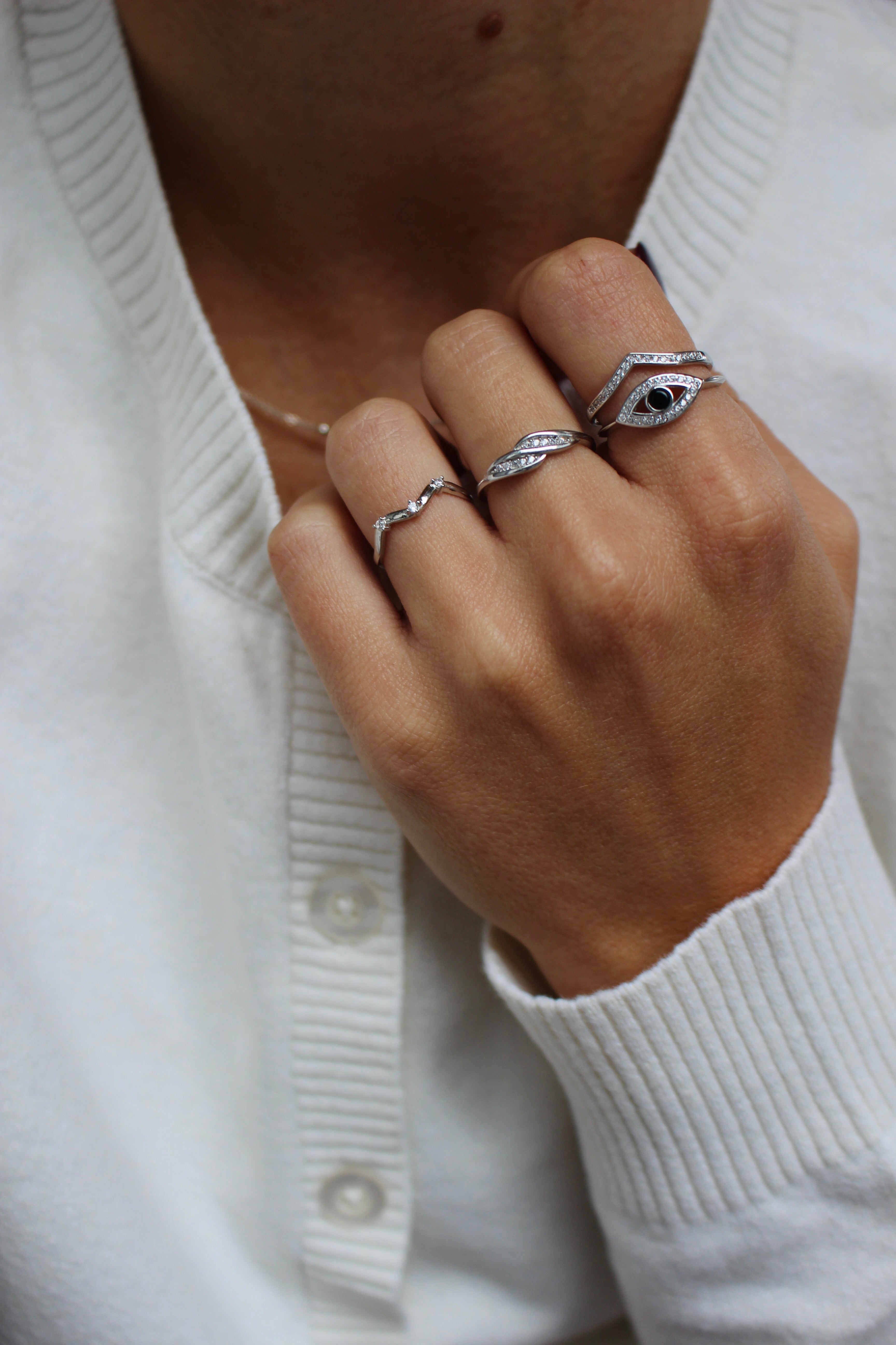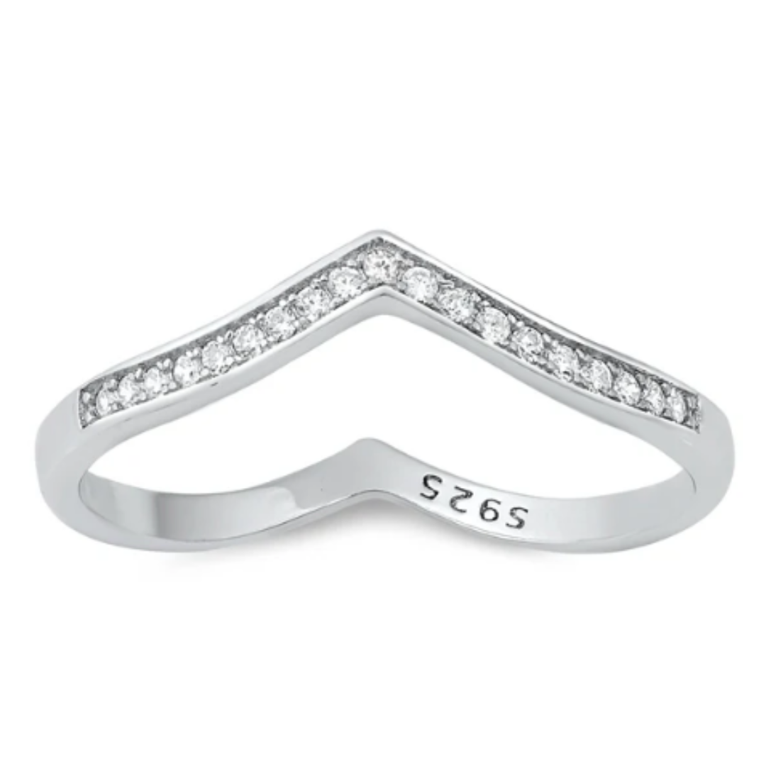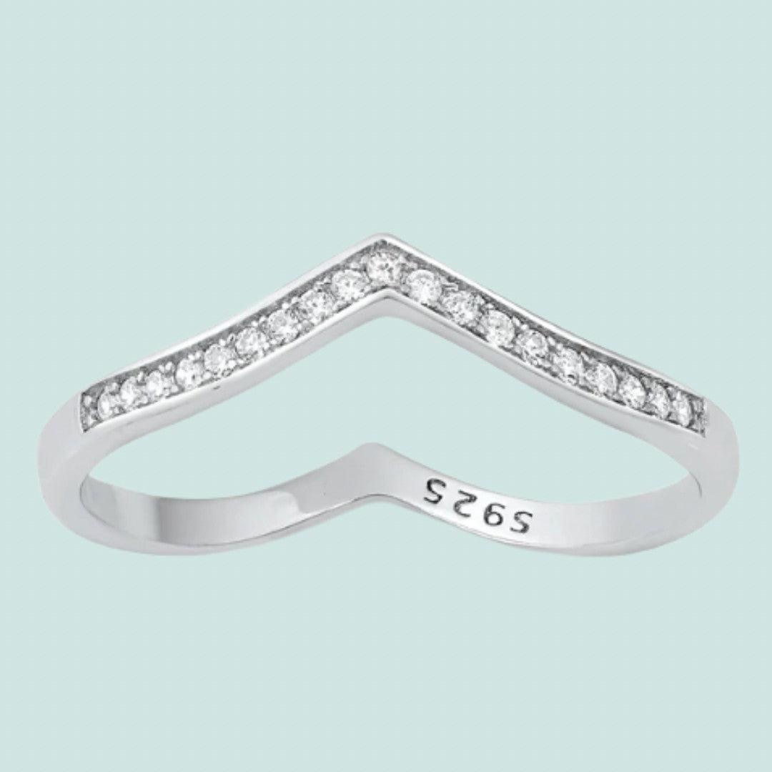 Une bague, deux looks! D’un côté, elle est ornée d’un “V” lisse pour un look classique et de l’autre, un “V” orné de zircons pour un look plus chic.